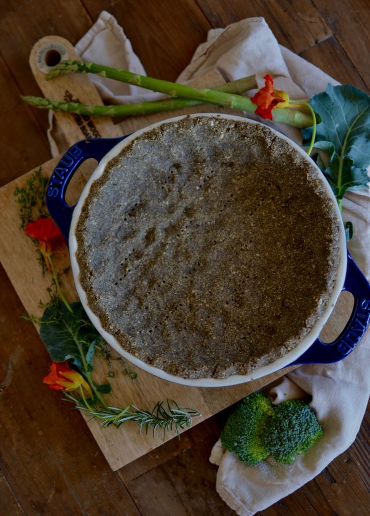 - Eine Quicheform buttern. Den Teig ausrollen und in die Form geben. Am Rand festdrücken. Nochmal für 15 Minuten in den Kühlschrank geben.