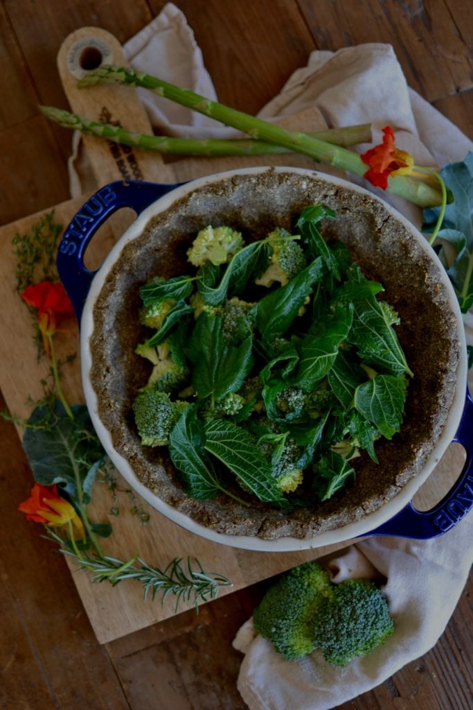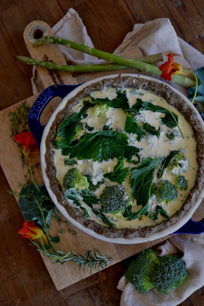 - Aus dem Ofen nehmen, mit Brokkoli und Brennesselblättern belegen und die Eier-Sahne darauf gießen.